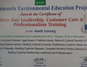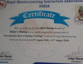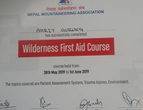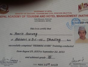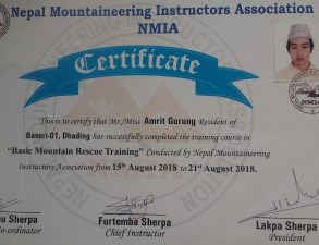 I am a registered trekking guide under the Nepal Academy of Tourism and Hotel Management (NATHM) 2011 and just completed the Mountain Leader course so now I’m a mountain leader. Mountain Leader Course-Component, Navigation Course, Rock climbing Course, Mountaineering course at Manang, Mountain rescue Training and social work with (W, F, P) World food programs in Rolwaling valley in 2014.